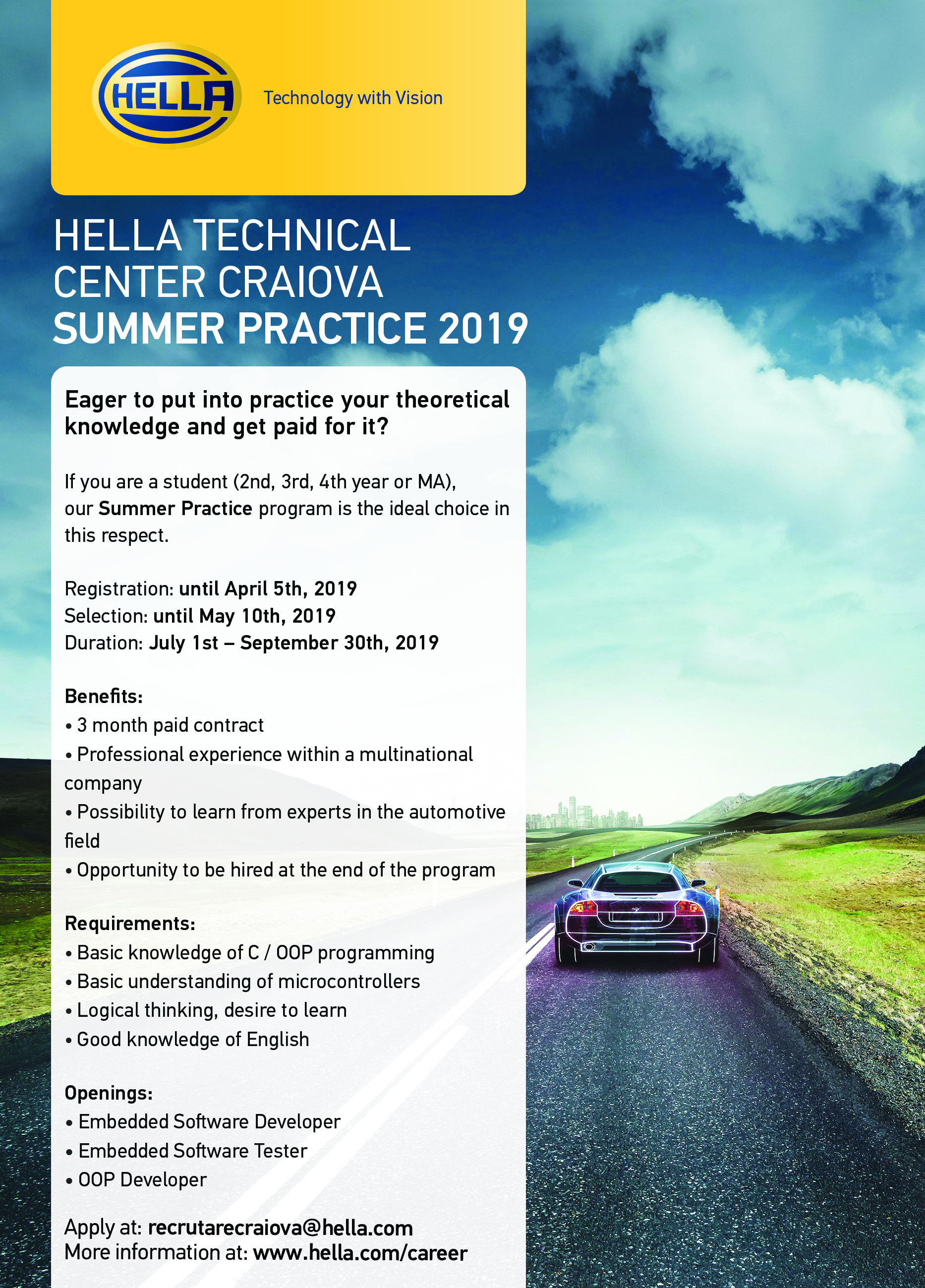 Inscrierile celor interesati se pot face pana pe 5 aprilie 2019, trimitand CV-ul la adresa de e-mail: recrutarecraiova@hella.com