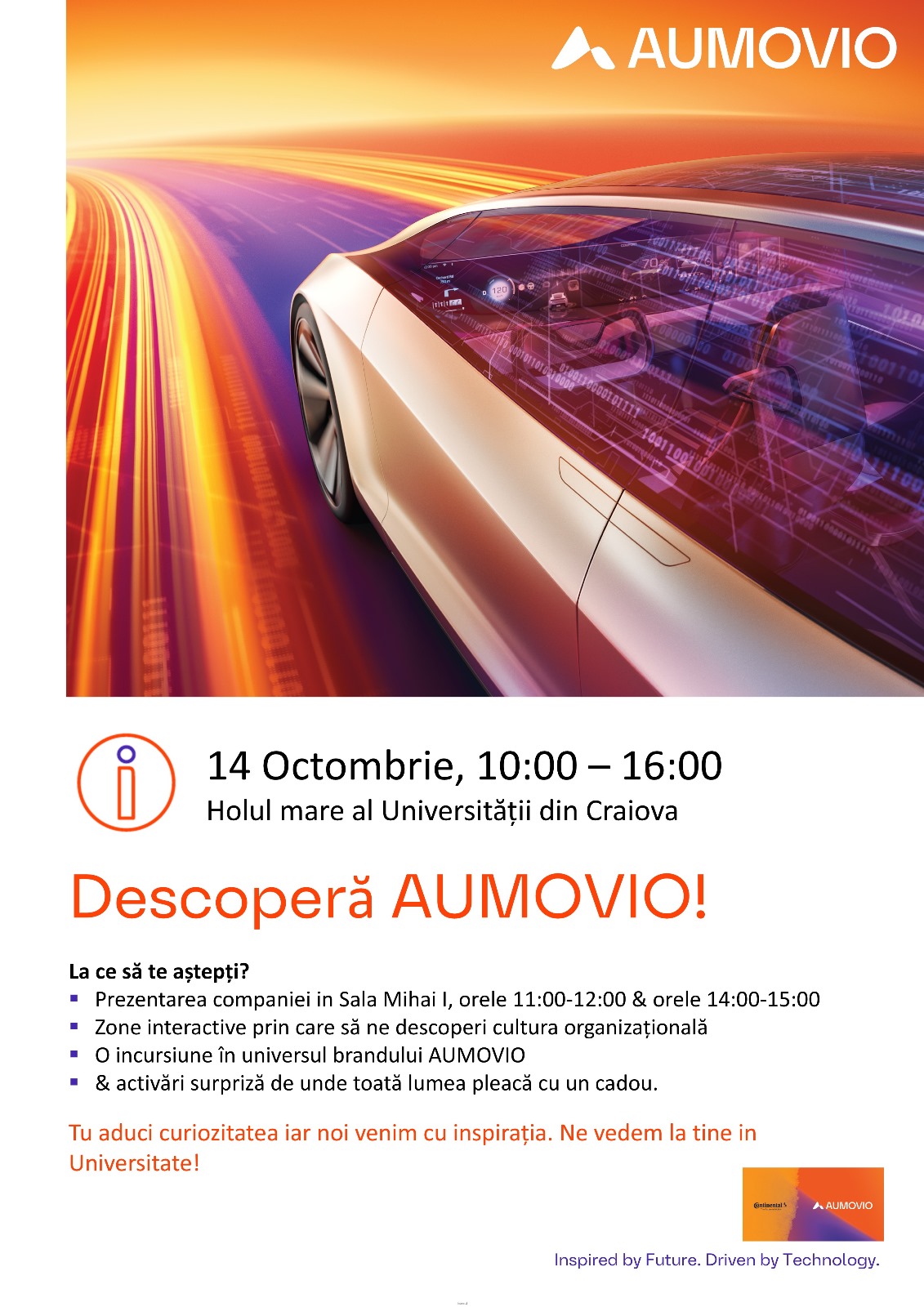 Vă informăm că marți, 14 octombrie 2025, în intervalul 10:00 – 16:00, va avea loc lansarea oficială a AUMOVIO în cadrul Universității din Craiova.
